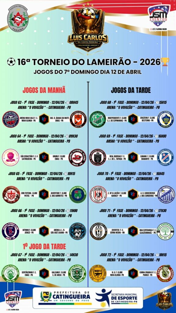 A programação terá início às 08h45, seguindo de forma intensa durante todo o domingo até às 18h15, proporcionando um verdadeiro espetáculo esportivo para o público presente. O Lameirão de Futebol vem sendo um grande sucesso em sua 16ª edição, com arquibancadas lotadas a cada rodada, consolidando-se como um dos eventos esportivos mais tradicionais e prestigiados da região.