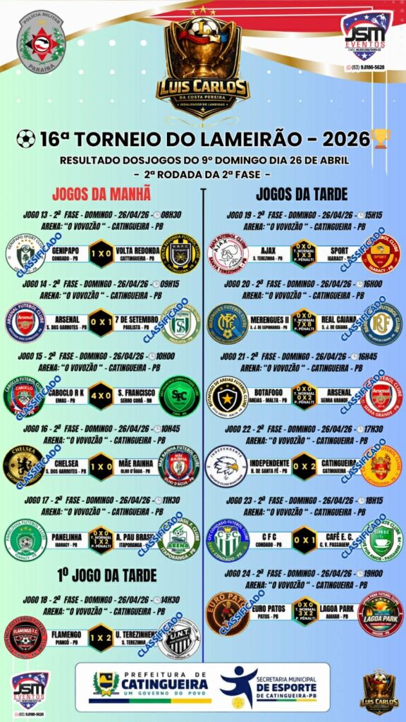 Ao todo, 12 jogos foram realizados ao longo do dia, desde o período da manhã até a noite, definindo as primeiras equipes classificadas para a terceira fase do torneio. Garantiram vaga na próxima etapa as seguintes equipes: Genipapo de Condado-PB, 7 de Setembro de Paulista-PB, Coboclo de Emas-PB, Chelsea de Santana dos Garrotes-PB, Pau Brasil de Itaporanga-PB, União Terezinhense de Santa Terezinha-PB, Sport de Igaracy-PB, Real Caiana de São J. de Caiana-PB, Arsenal de Serra Grande-PB, Catingueira FC, Café EC de Passagem-PB e Euro Patos de Patos-PB.