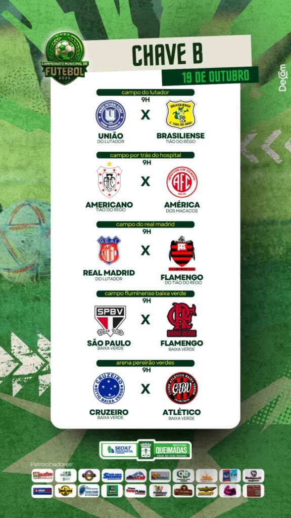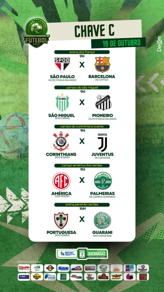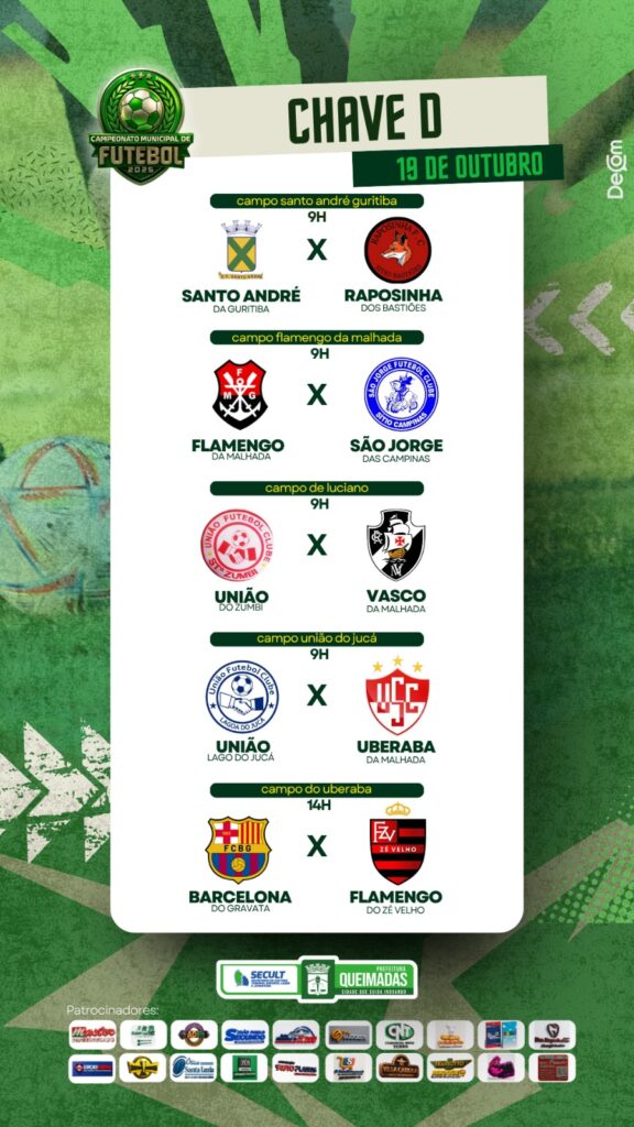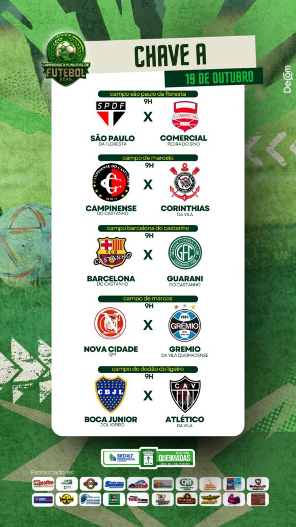 A competição que já vem sendo um sucesso total e agitando os desportistas de Queimadas e região, promete mais um domingão esportivo de muita emoção e disputa pelos campos de futebol do município. Ao todo, 40 partidas serão realizadas, 20 pela categoria principal e 20 pela categoria aspirante, movimentando diversos campos e comunidades esportivas de Queimadas.