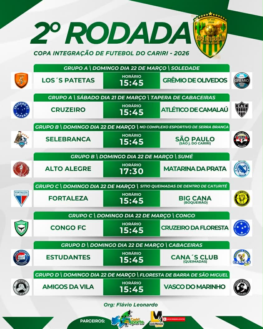 Destaque Copa Integração de Futebol retorna com 8 jogos pela segunda rodada neste final de semana Após o grande sucesso em sua abertura, a 13ª Copa Integração de Futebol do Cariri volta a movimentar a região neste final de semana com
