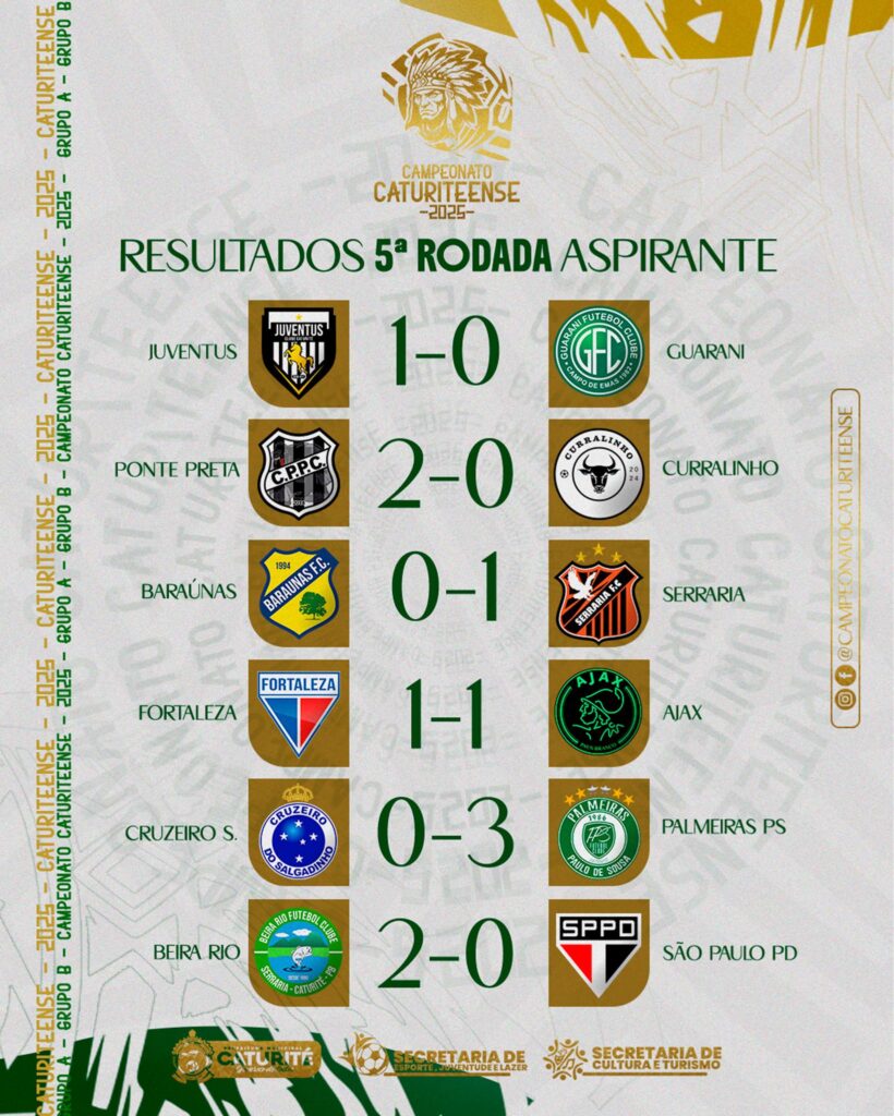 Confira os resultados dos jogos da quinta rodada do Campeonato Municipal de Futebol Amador de Caturité nas categorias aspirantes e titular:
