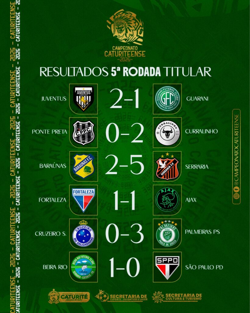 A rodada deste domingo teve destaque pelas vitórias das equipes do Beira Rio e Serraria, ambas da comunidade de Serraria, na qual vem mantendo um excelente desempenho no campeonato de Caturité, conquistando vitórias importantes e se consolidando nessa 5ª rodada na primeira colocação da tabela nos grupos A e B da competição.