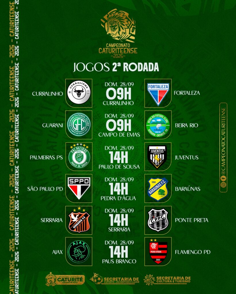 Após o grande sucesso e prestigio dos desportistas em sua abertura, o Campeonato Municipal Caturiteense de Futebol edição 2025 retorna neste domingo, dia 28, com os jogos correspondentes a segunda rodada do certame.