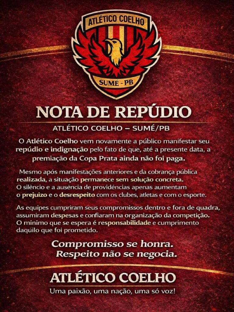 Atlético Coelho de Sumé emite nova nota de repúdio e volta a cobrar da organização da Copa Prata de Futsal o valor da premiação em dinheiro