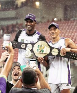 Após o apito final, o atleta paraibano celebrou a conquista junto a membros da comissão técnica, staff, empresários e patrocinadores nas arquibancadas da Arena Pernambuco, em uma comemoração marcada pela forte presença do público.