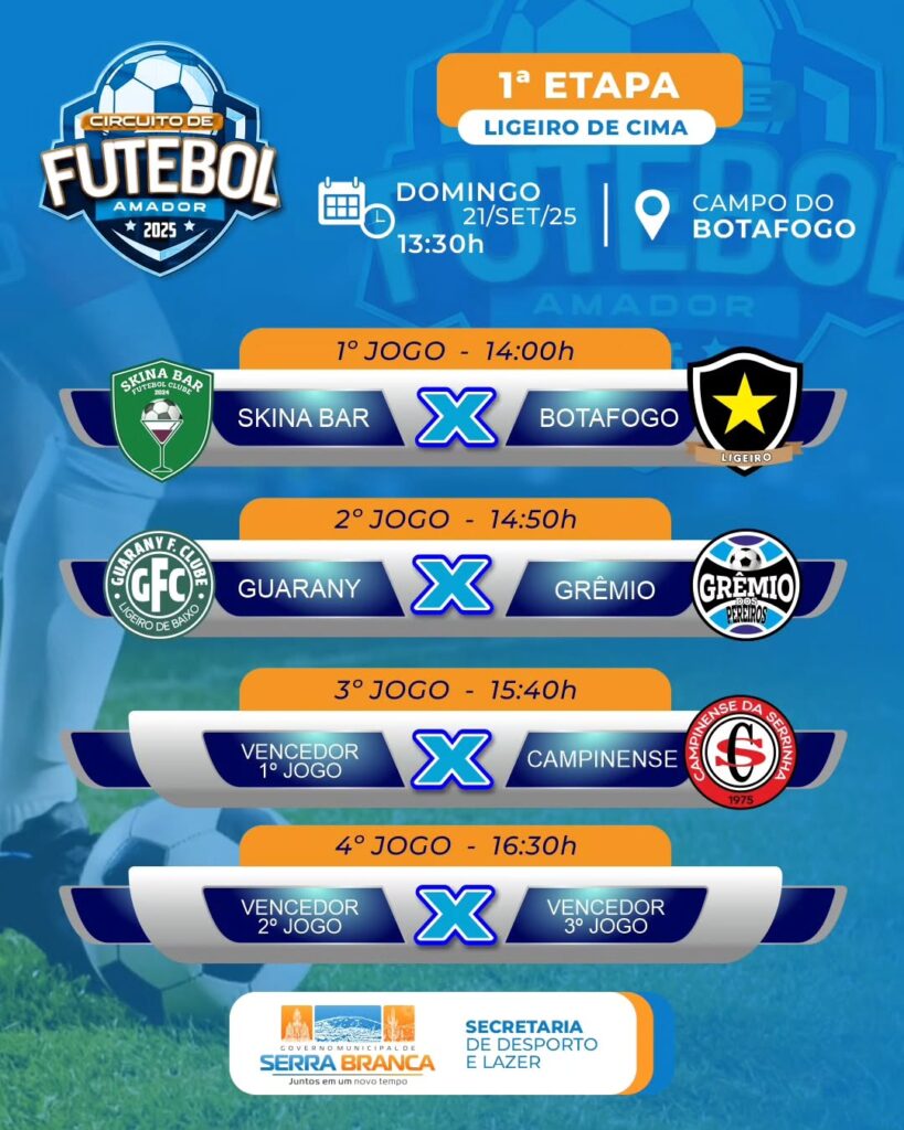 A primeira etapa será realizada no Campo do Botafogo, na comunidade do Ligeiro de Cima, a partir das 13h30. Nesta fase inicial, entram em campo as equipes locais que representam a região do Ligeiro: Skina Bar, Botafogo, Guarany, Grêmio e Campinense.