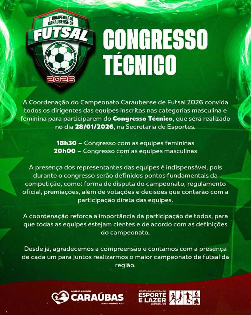 A Prefeitura Municipal de Caraúbas, por meio da Secretaria de Esporte e Lazer, estará realizando nesta quarta-feira, dia 28, o Congresso Técnico do 1º Campeonato Caraubense de Futsal, competição inédita na história do município de Caraúbas-PB.