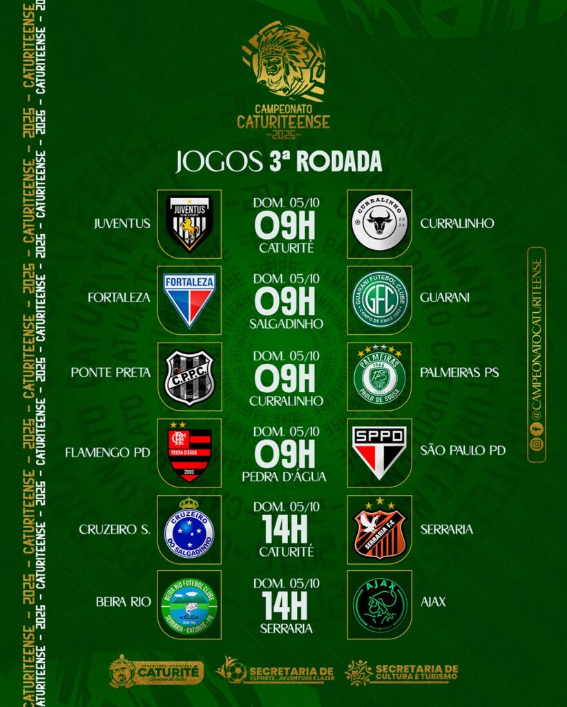 Após duas rodadas bastante disputadas e equilibradas, o Campeonato Municipal Caturiteense de Futebol edição 2025 retorna neste domingo, dia 05, com os jogos correspondentes a terceira rodada do certame.