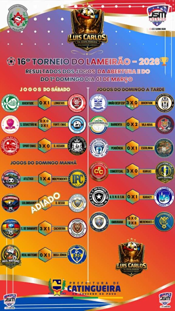 Com premiação total de R$ 45 mil em dinheiro, o Lameirão de Futebol 2026 promete ser mais uma edição histórica. A competição terá a participação de mais de 100 equipes e terá uma duração de três meses, seguindo até o mês de maio, consolidando-se como um verdadeiro palco do futebol amador de Catingueira e de toda a região.
