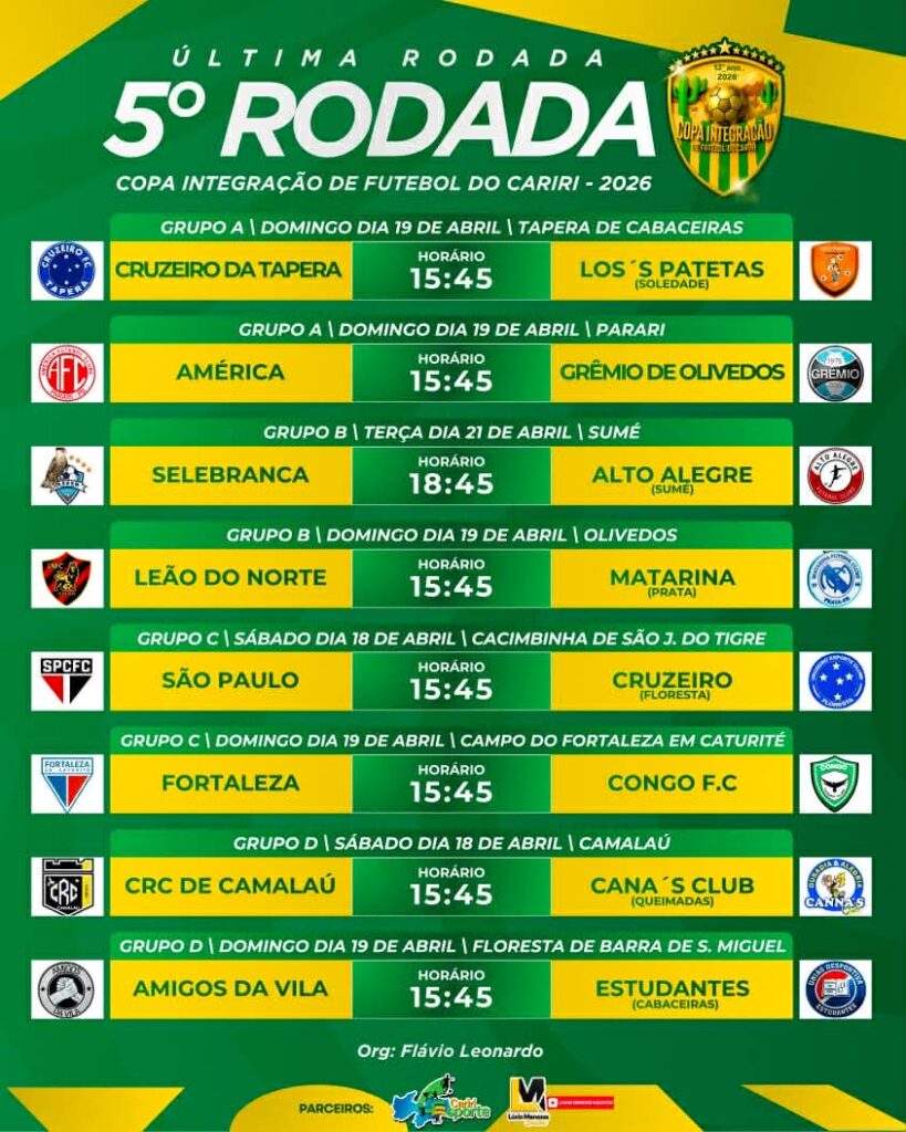 A quinta e última rodada terá início neste sábado (18), com a realização de duas partidas. No domingo (19), a competição ganha sequência com mais cinco jogos, movimentando o tradicional domingo esportivo no Cariri. O encerramento da rodada acontece na próxima terça-feira (21), totalizando oito confrontos decisivos.