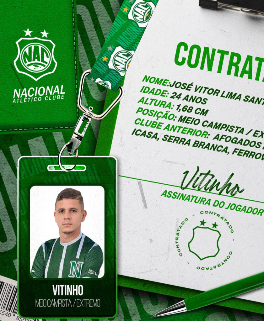 Após passagem rápida pelo Potiguar de Mossoró-RN e Rio Grande SAF, o atacante Vitinho foi anunciado na noite desta quinta-feira(02), como o segundo reforço da equipe do Nacional de Patos para 2026.