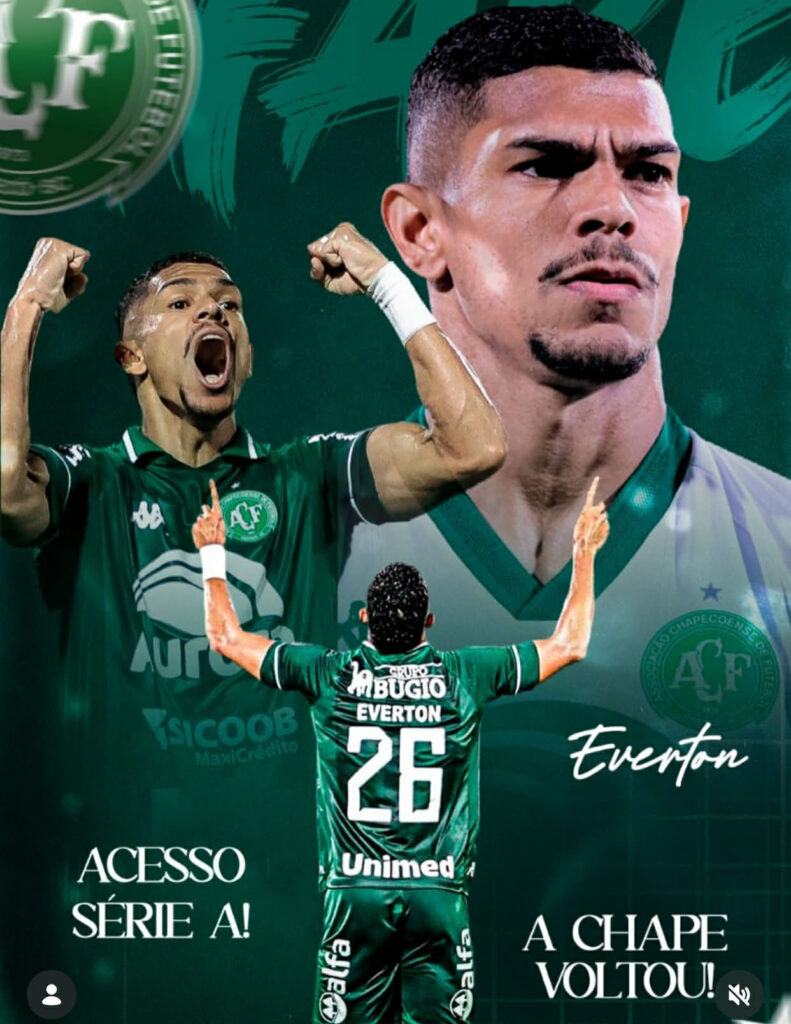 Destaque do Serra Branca SAF no Campeonato Paraibano deste ano, o lateral-direito Everton Souza comemorou o retorno da Chapecoense à elite do futebol brasileiro. A equipe catarinense garantiu sua volta à Série A do Brasileirão após quatro anos, fechando a competição na terceira colocação e confirmando o acesso neste último domingo, ao vencer o Atlético-GO.