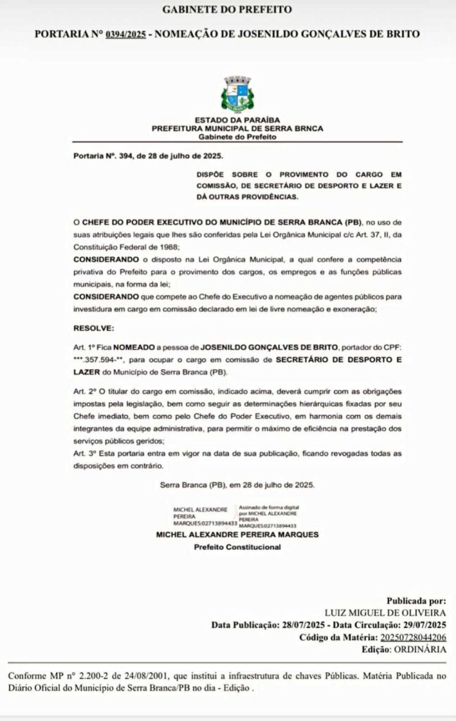 A nomeação foi oficializada por meio de portaria publicada pela Prefeitura Municipal de Serra Branca, atendendo a uma decisão do prefeito Alexandre. A escolha de Galeguinho marca a criação da nova Secretaria de Esportes, que passou a funcionar de forma independente após ser desmembrada da Secretaria de Educação.
