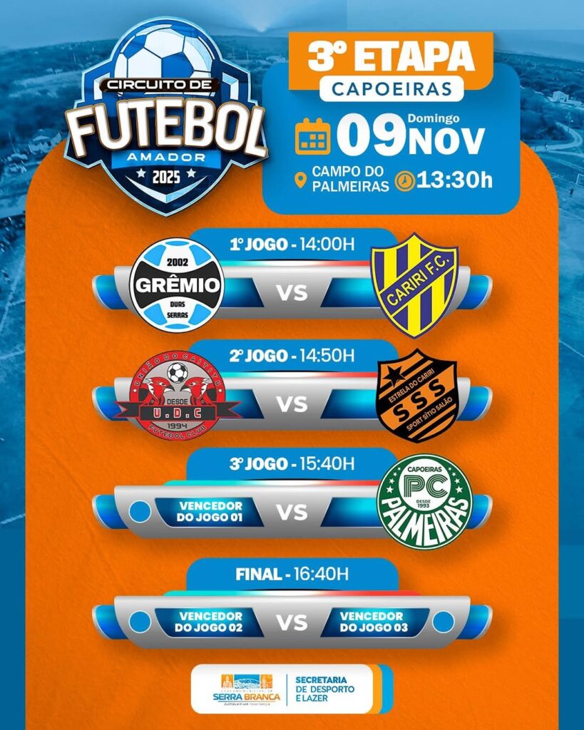 Neste domingo, dia 09, o futebol amador voltará a ser destaque no município de Serra Branca, com a realização da terceira etapa do Circuito de Futebol Amador de Serra Branca.