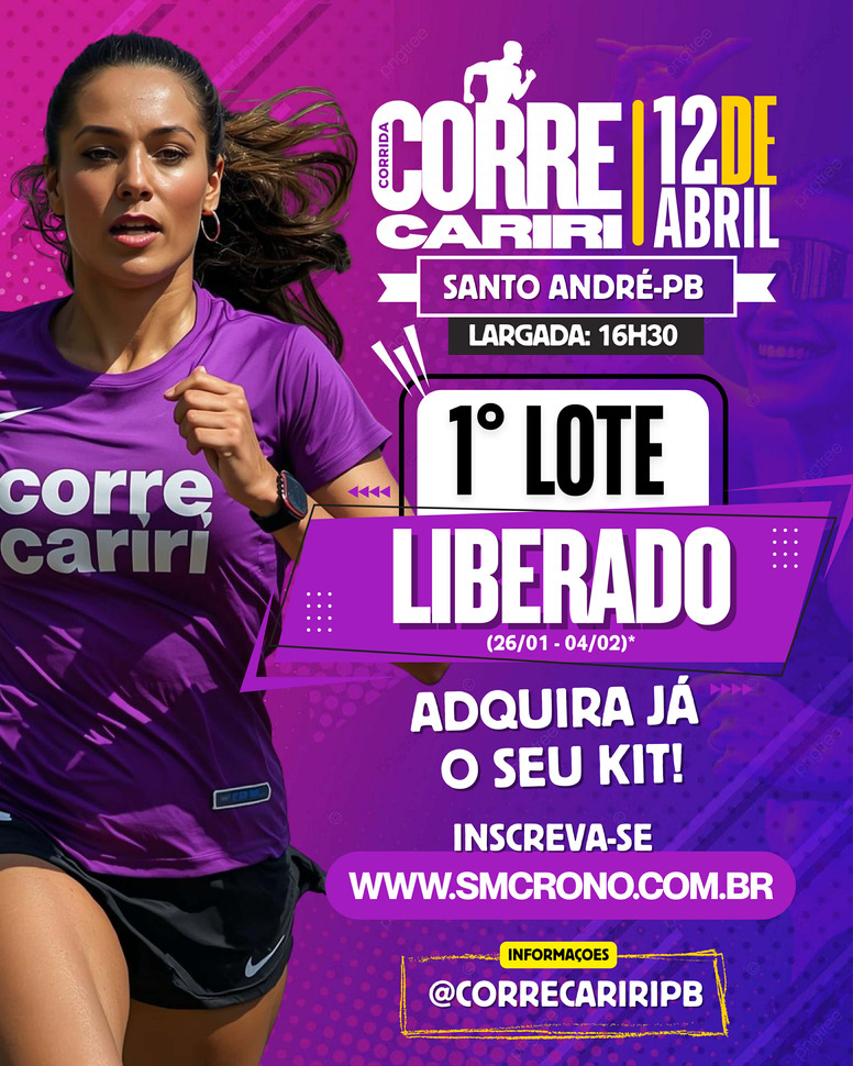 A largada está prevista para as 16h30. O Corre Cariri nasce com a proposta de incentivar a prática esportiva, promover saúde e bem-estar, além de fortalecer a integração regional por meio do esporte. A expectativa da organização é reunir atletas da Paraíba e de diversas cidades da região, consolidando o evento como uma importante iniciativa no calendário esportivo do Cariri.