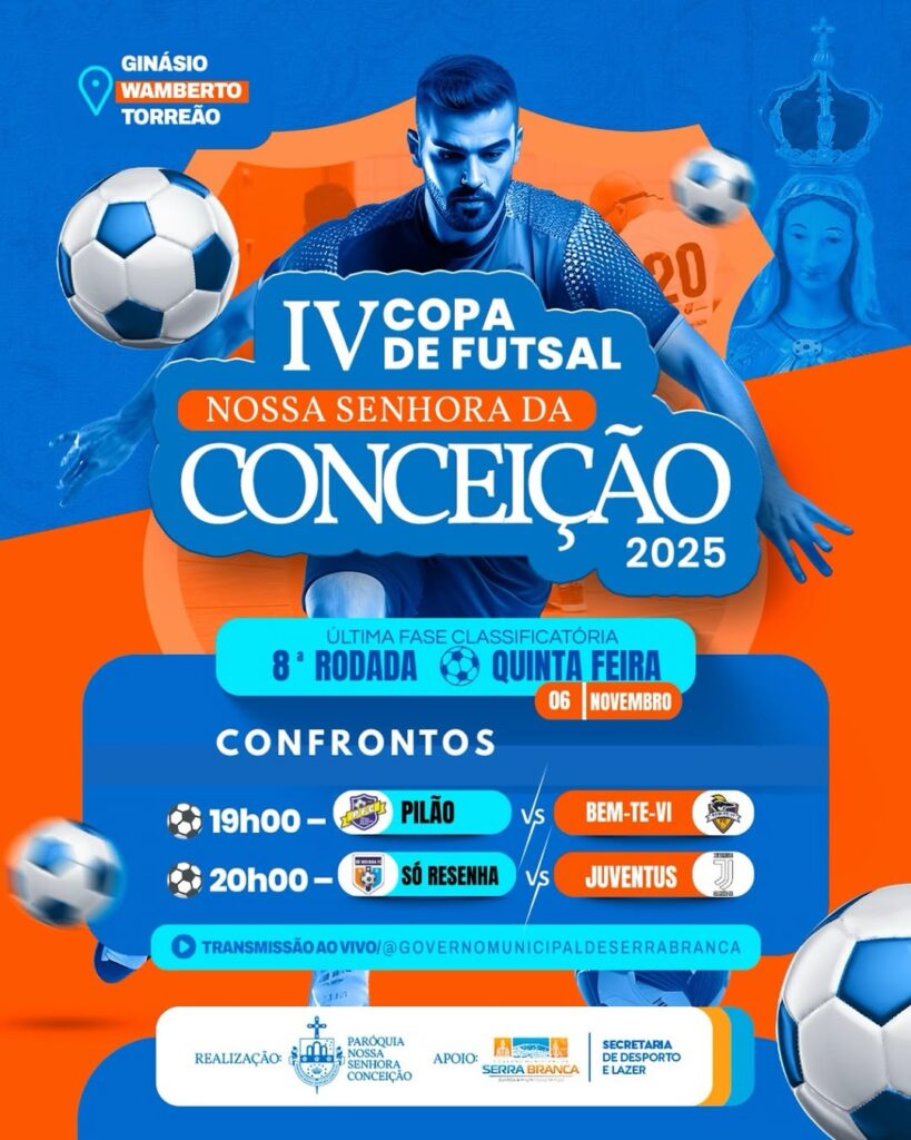 A emoção da IV Copa de Futsal Nossa Senhora da Conceição 2025 continua nesta quinta-feira (06/11), com a realização da 8ª rodada da competição, prometendo mais uma noite de muita disputa, garra e torcida no Ginásio Wamberto Torreão, na cidade de Serra Branca.