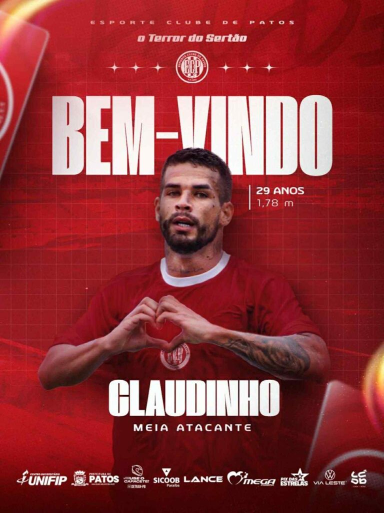 A equipe do Esporte de Patos segue se reforçando para a disputa do Campeonato Paraibano de Futebol 2026. A mais nova contratação é o meia-atacante Claudinho, de 29 anos, que chega ao Terror do Sertão para fortalecer ainda mais o setor ofensivo da equipe.