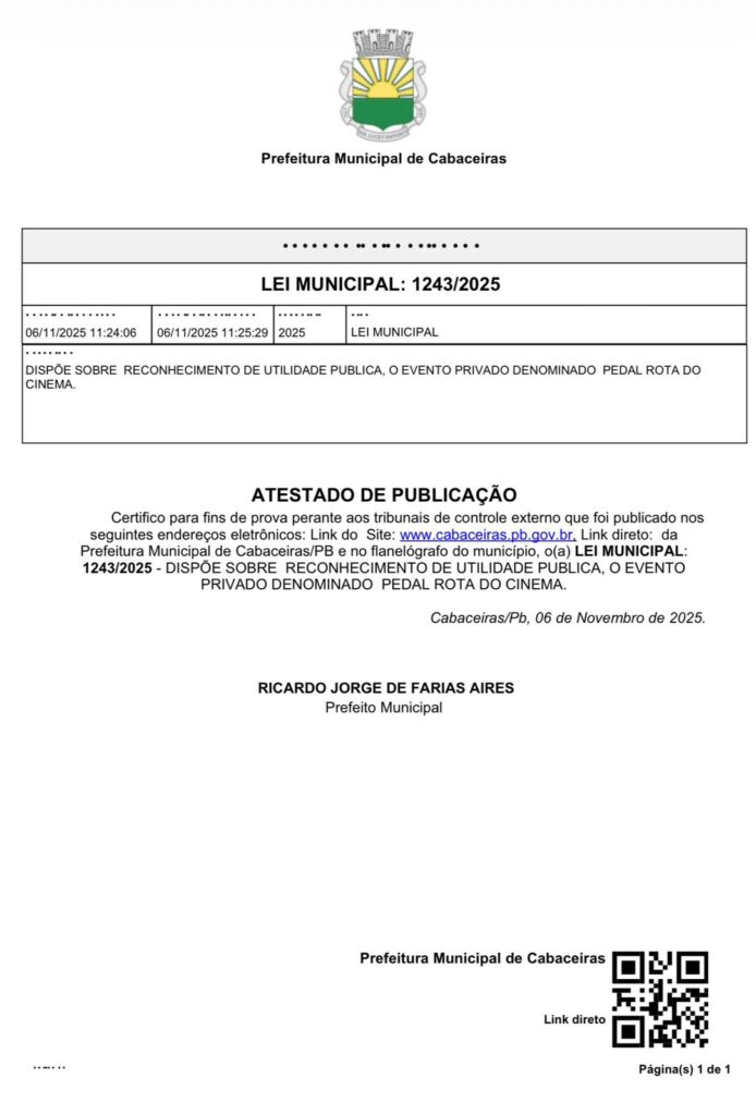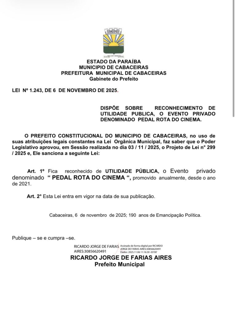 O município de Cabaceiras-PB ganhou um novo marco em sua história esportiva e cultural. O prefeito Ricardo Aires sancionou a Lei Municipal nº 1.243/2025, que reconhece oficialmente o Pedal Rota do Cinema como evento de utilidade pública.