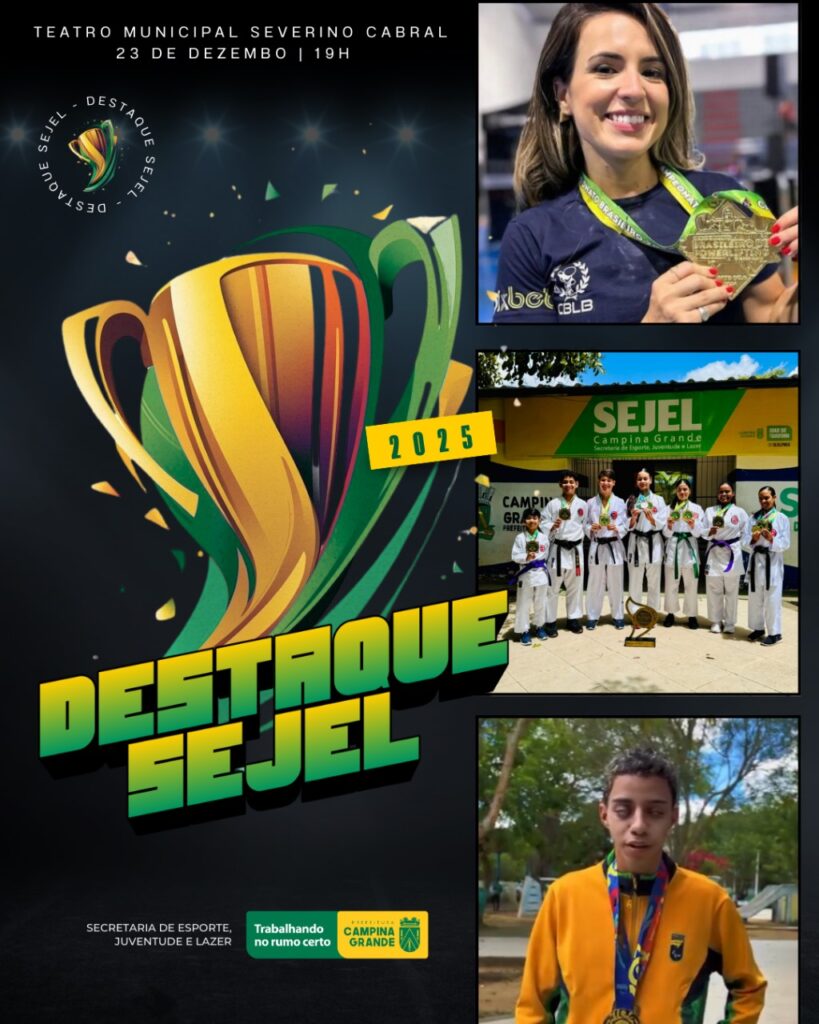 A Secretaria de Esporte, Juventude e Lazer (Sejel), da Prefeitura de Campina Grande, vai entregar no próximo dia 23, no Teatro Municipal Severino Cabral, a partir das 19h o prêmio de reconhecimento aos atletas campinenses denominado de “Destaque Sejel”, a mais de 150 atletas que neste ano de 2025 competiram em diversas modalidades esportivas em níveis Regional, Nacional e Internacional. Todos os atletas que serão homenageados, foram apoiados pela Sejel Campina Grande.
