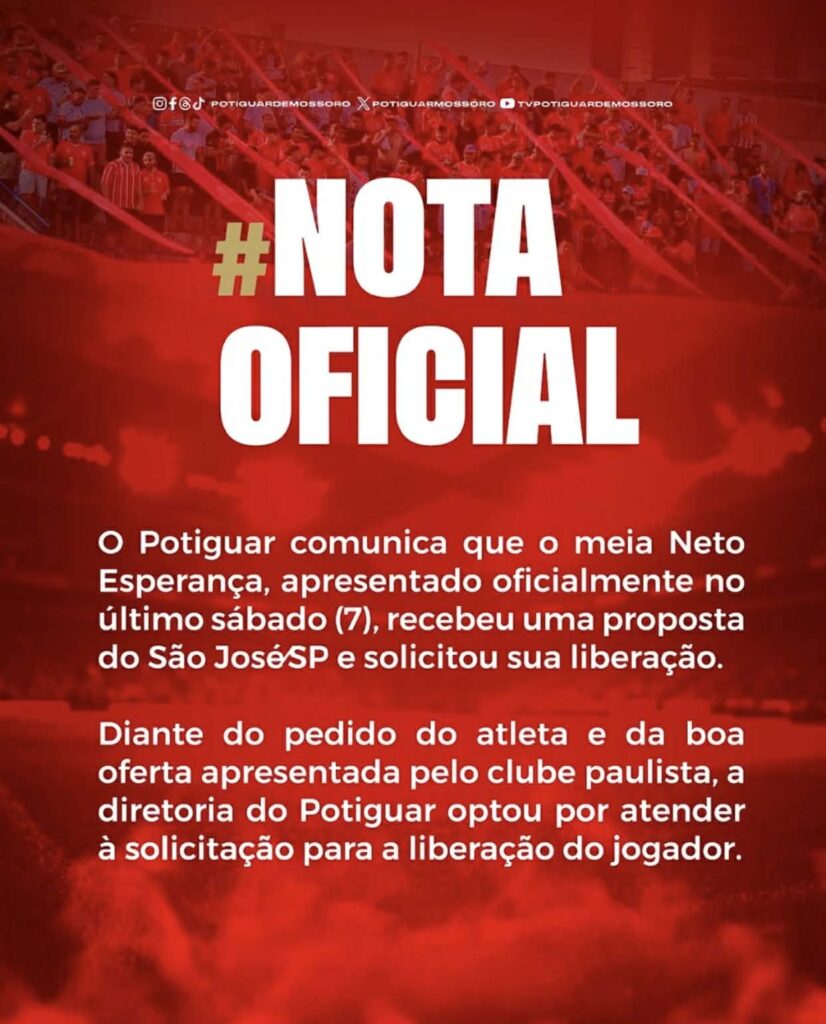 Diante do pedido do jogador e da boa oferta apresentada pelo clube paulista, a diretoria do Potiguar optou por atender à solicitação. Neto Esperança deverá ser anunciado nos próximos dias como o mais novo reforço do São José-SP, dando sequência à sua carreira agora no futebol paulista.