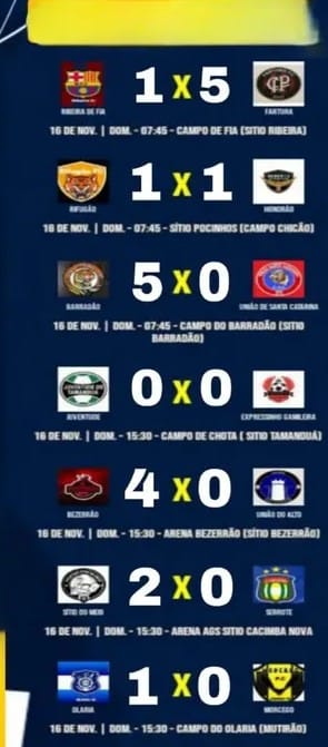 Em Cacimba Nova, o Sítio do Meio conseguiu um triunfo por 2 a 0 sobre o Serrote, enquanto no Campo do Olaria, o time do Olaria venceu o Morcegão por 1 a 0, fechando a rodada.