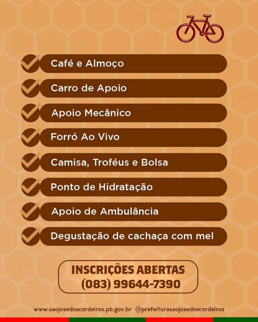 O evento contará com uma programação completa, oferecendo aos participantes café da manhã, almoço, carro de apoio, assistência mecânica, forró ao vivo, camisa personalizada, troféus, bolsa, pontos de hidratação, apoio de ambulância, degustação de cachaça com mel e muito mais.