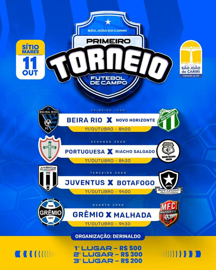 A Secretaria de Esportes de São João do Cariri ofertará uma premiação total de R$ 1.000,00 destinada às equipes finalistas, como forma de valorizar e incentivar o futebol amador do município. O evento terá o suporte de organização do desportista da comunidade dos Mares, Derinaldo.