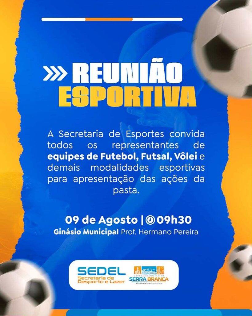 A Prefeitura Municipal de Serra Branca, por meio da Secretaria de Esportes, anunciou nas redes sociais a realização de uma importante reunião com representantes de equipes de futebol, futsal, vôlei e demais modalidades esportivas praticadas no município.