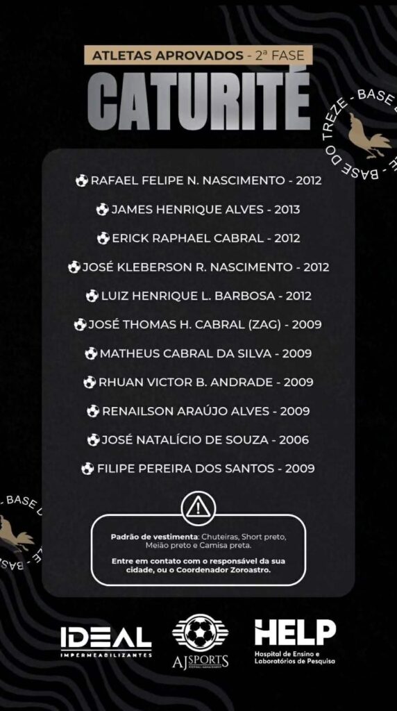A seletiva aconteceu nas categorias Sub-14, Sub-18 e Sub-20, e ao final dos trabalhos, 11 atletas do município de Caturité garantiram vaga na segunda etapa, mantendo vivo o sonho de vestir a camisa de um dos clubes mais tradicionais da Paraíba.