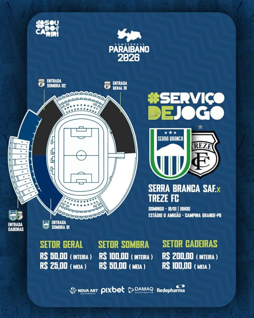 Nesta terça-feira (13), a diretoria do Serra Branca SAF divulgou oficialmente os valores dos ingressos para a estreia do Carcará do Cariri no Campeonato Paraibano 2026.