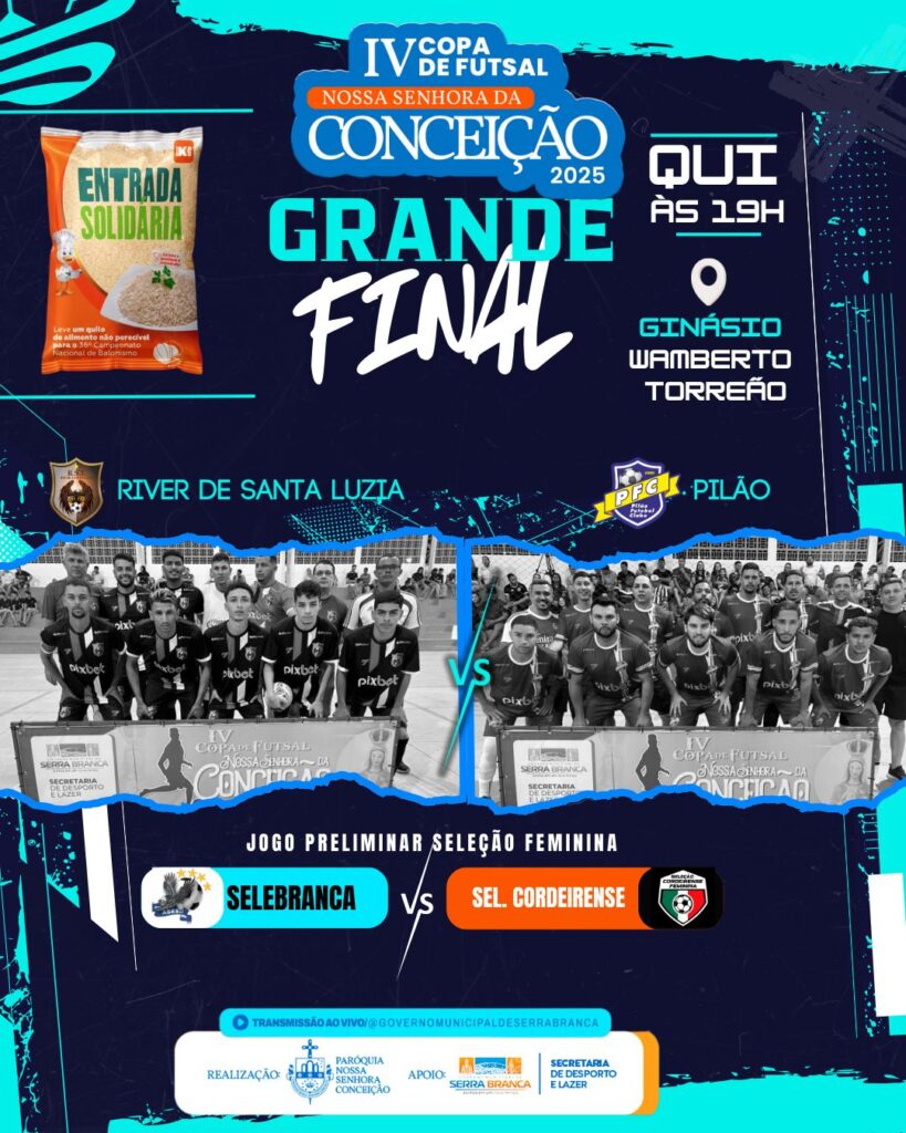 A emoção do futsal vai tomar conta de Serra Branca nesta quinta-feira, 4 de dezembro, quando acontece a grande final da 4ª Copa de Futsal Nossa Senhora da Conceição. A competição, que ao longo dos últimos anos se firmou como um dos eventos esportivos mais tradicionais e aguardados do município, chega ao seu momento mais emocionante com o duelo entre Pilão Futsal Clube e River de Santa Luzia do Cariri.