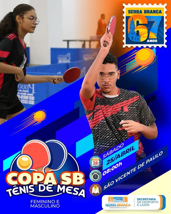 Integrando a programação comemorativa dos 67 anos de emancipação política do município de Serra Branca, a Prefeitura Municipal, por meio da Secretaria de Desporto e Lazer, realizará a 1ª Copa Serra Branca de Tênis de Mesa, nas categorias feminino e masculino.