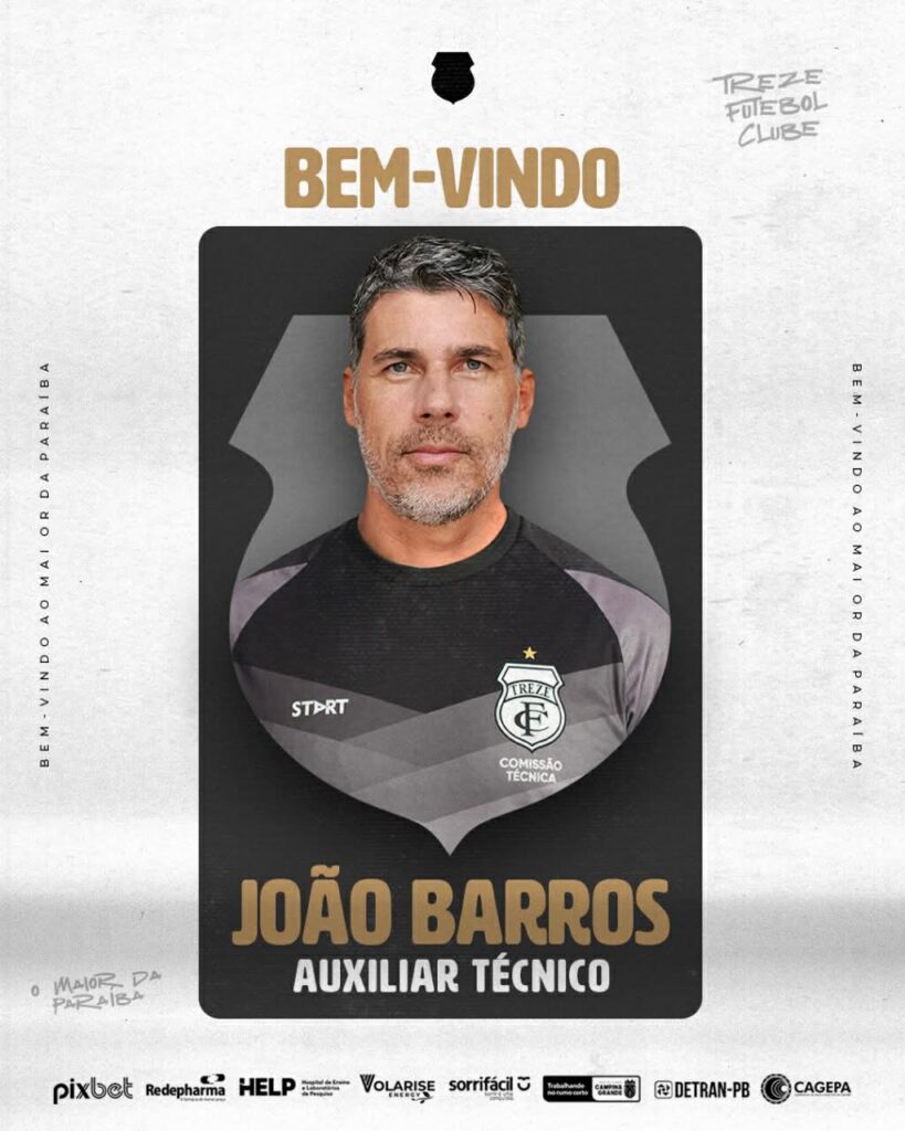 O Treze Futebol Clube oficializou a chegada de João Barros como novo auxiliar-técnico para a temporada 2026.