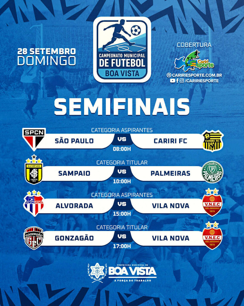Na categoria aspirantes, os confrontos serão: • 08h00 – São Paulo x Cariri • 15h00 – Alvorada x Vila Nova